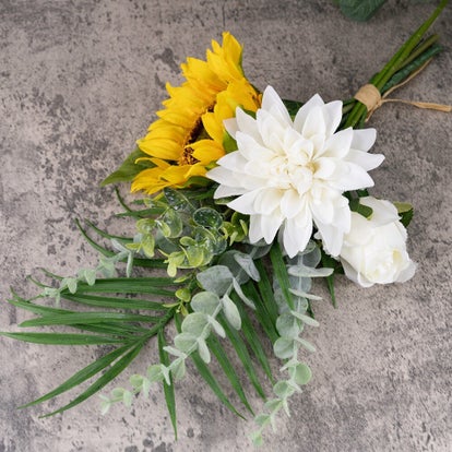 The price tag is one bundle, which is composed of a combination of 1 sunflower, 1 dahlia, 1 rose bud, and several matching leaves